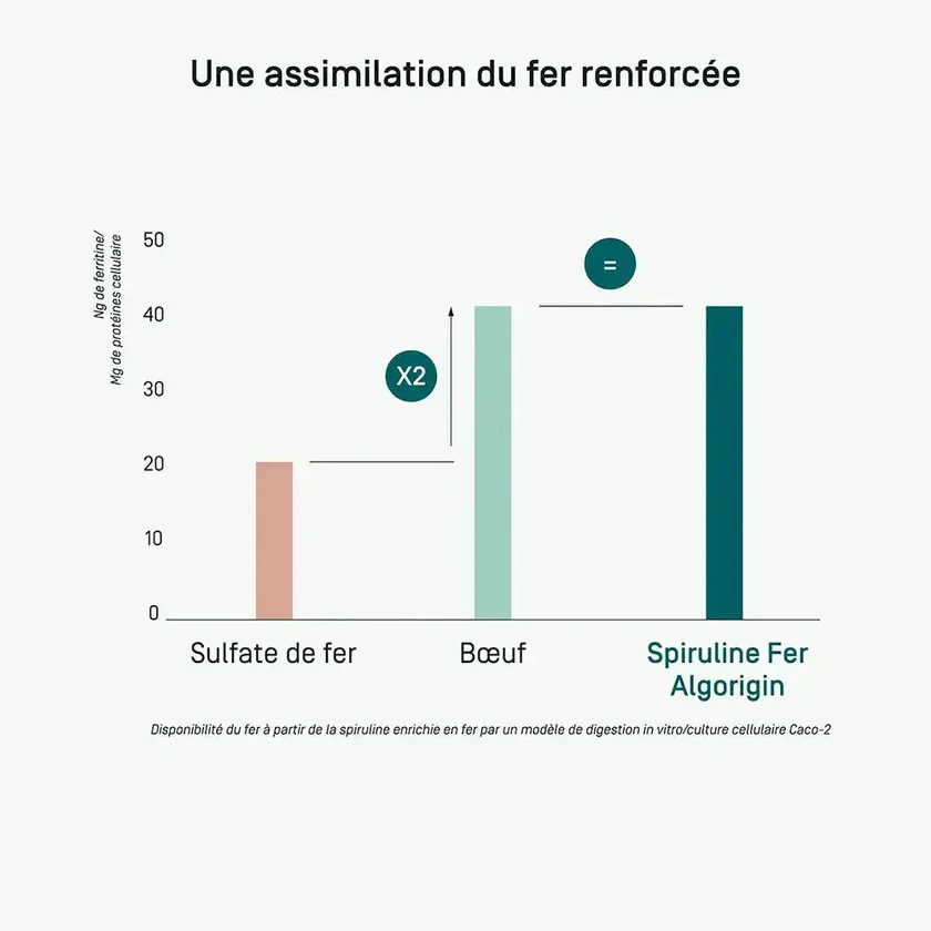 La Spiruline Fer Bio apporte du fer intégré naturellement à la micro-algue, donc :