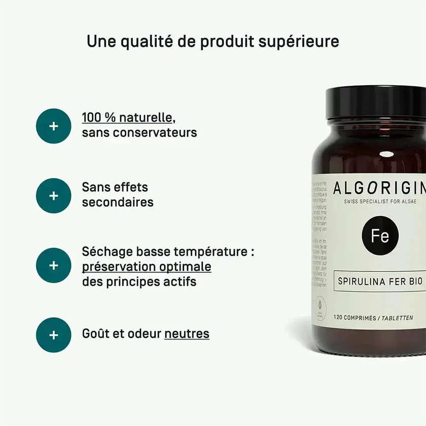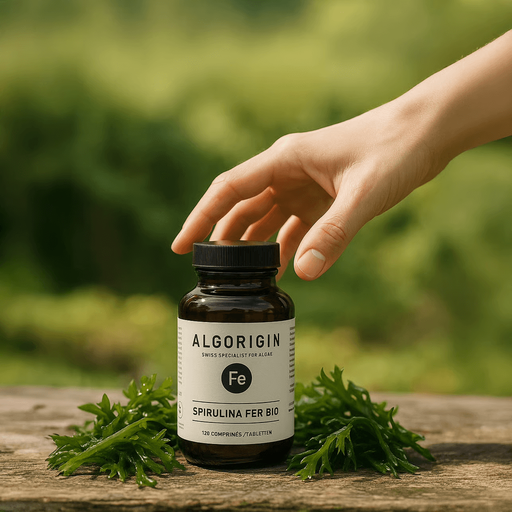 Le fer intégré naturellement dans la spiruline est mieux toléré et absorbé que le fer classique, évitant les nausées et la constipation fréquentes avec les compléments traditionnels.